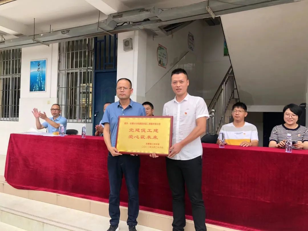 第三個(gè)議程:永泰S213線路面改造工程臨時(shí)黨小組與中共永泰縣三洋中學(xué)黨支部舉行黨建共建授牌儀式。